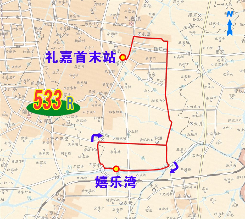 533路: 由禮嘉首末站始發(fā),經(jīng)禮政路、禮新路、禮毛路、南環(huán)線至嬉樂灣后返回。沿途??垦赝就?慷Y政路武進大道、禮嘉商貿(mào)城、禮嘉醫(yī)院、禮嘉中學(xué)、陸莊村委、陸莊、陽沿橋、毛家橋、毛家村、毛家村南、華渡村委、華渡橋、薰衣草莊園、談溝橋等站。