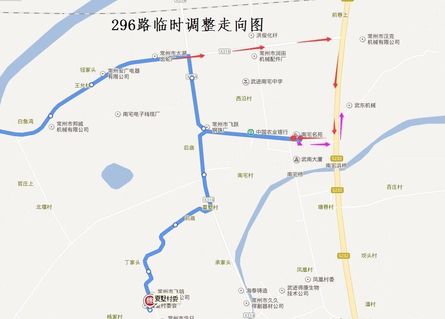 296路:由前黃公交中心站始發(fā),按原線路行駛至運農(nóng)線前南公路路口后,調(diào)整行駛運農(nóng)線、S232、鎮(zhèn)南路至南宅公交站返回。臨時撤銷前南公路(運農(nóng)線—夏墅村道)、鎮(zhèn)南路(前南公路—南宅公交站)、夏墅村道(前南公路—夏墅村委)行駛路段,同步撤銷“南宅西、南宅小學、前廟、丁家頭、夏墅村委”雙向??空?;“王允村”站臨時移至運農(nóng)線上???,調(diào)整行駛路段增設(shè)“南宅浜橋” 雙向臨時??空?。
