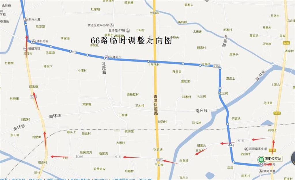 66路:由南宅公交站始發(fā),調(diào)整行駛鎮(zhèn)南路、S232、運農(nóng)線、常武南路至前南公路路口后恢復原路線行駛。臨時撤銷鎮(zhèn)南路(回車場—前南公路)、前南公路(鎮(zhèn)南路—常武南路)行駛路段,同步撤銷“南宅西、何家頭、華渡橋、華渡村委、黃泥溝、陸田舍、十車垛、李家塘、大漕村、小漕村、小漕西、前黃東”雙向??空荆?ldquo;王允村”站臨時移至運農(nóng)線上??浚{(diào)整行駛路段增設(shè)“南宅浜橋、王允村委、白圩灣、朱家渡橋、農(nóng)場村、后黃泥溝、運村北、劉墅、顧家橋、漳湟村”雙向臨時停靠站。