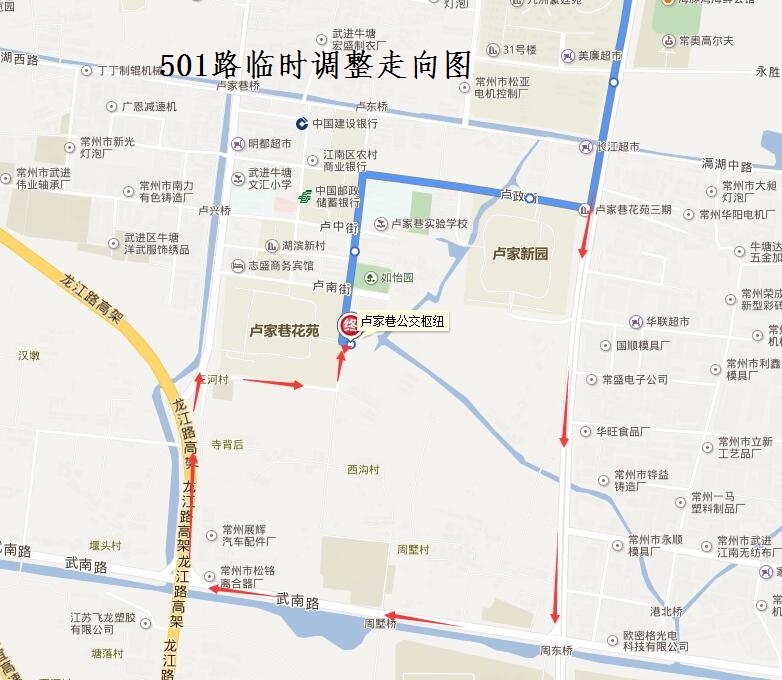 501路:由陽(yáng)湖廣場(chǎng)始發(fā),按原線路行駛至長(zhǎng)江路盧政街路口后,調(diào)整行駛長(zhǎng)江路、武南路、龍江路、湖濱路、科創(chuàng)路、東橋南路至盧家巷公交樞紐返回。臨時(shí)撤銷盧政街(長(zhǎng)江路—東橋南路)、東橋南路(盧政街—盧南街)行駛路段,同步撤銷“盧家新園、盧家巷幼兒園”雙向??空荆徽{(diào)整行駛路段增設(shè)“盧家新園東、港東橋、周墅橋、武南路湖濱路、三河村委”雙向臨時(shí)??空?。