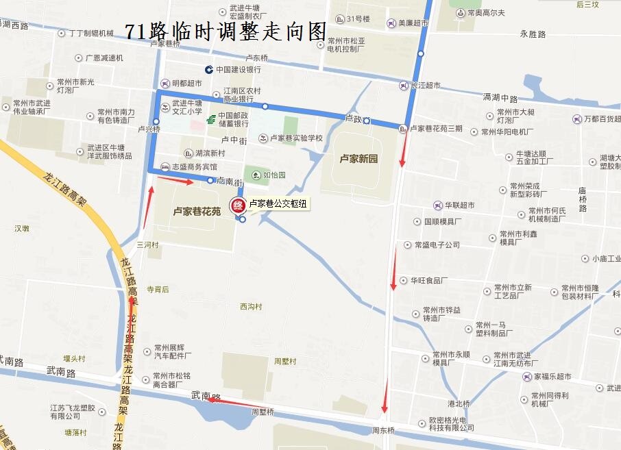 71路:由湖塘紡織城公交中心站始發(fā),按原線路行駛至長(zhǎng)江路盧政街路口后,調(diào)整行駛長(zhǎng)江路、武南路、龍江路、湖濱路至盧南街路口后恢復(fù)原線行駛。臨時(shí)撤銷盧政街(長(zhǎng)江路—湖濱路)、湖濱路(盧政街—盧南街)行駛路段,同步撤銷“盧家新園、盧政街東橋南路、盧興橋”雙向??空?;調(diào)整行駛路段增設(shè)“盧家新園東、港東橋、周墅橋、武南路湖濱路”雙向臨時(shí)??空?。
