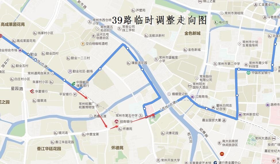 39路:由棕櫚路龍江路始發(fā),按原線路行駛至勤業(yè)路大倉路路口后,調(diào)整行駛勤業(yè)路、懷德路至勞動路路口后恢復原行駛路線。臨時撤消大倉路(勤業(yè)路—西倉街)、西倉街(大倉路—常春弄)、常春弄(西倉街—懷德路)行駛路段。同步撤銷“大倉路、西倉橋、南運橋西、第四醫(yī)院”雙向??空荆{(diào)整行駛路段新增設(shè)“常州梳篦博物館、懷德橋西”雙向臨時??空尽?br>