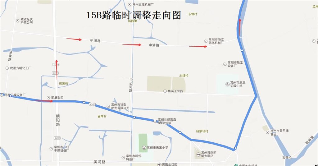 15B路:由常州客運中心始發(fā),按原線路行駛至常焦路朝陽路路口后,調整行駛朝陽路、申浦路至舜焦路路口后恢復原線路行駛。臨時撤銷常焦路(朝陽路—舜河路)、舜河路(常焦路—舜焦路)、舜焦路(舜河路—申浦路)行駛路段,同步撤銷“常焦路朝陽路、省岸、焦溪西站、焦溪胡家場、柳維橋”雙向停靠站。