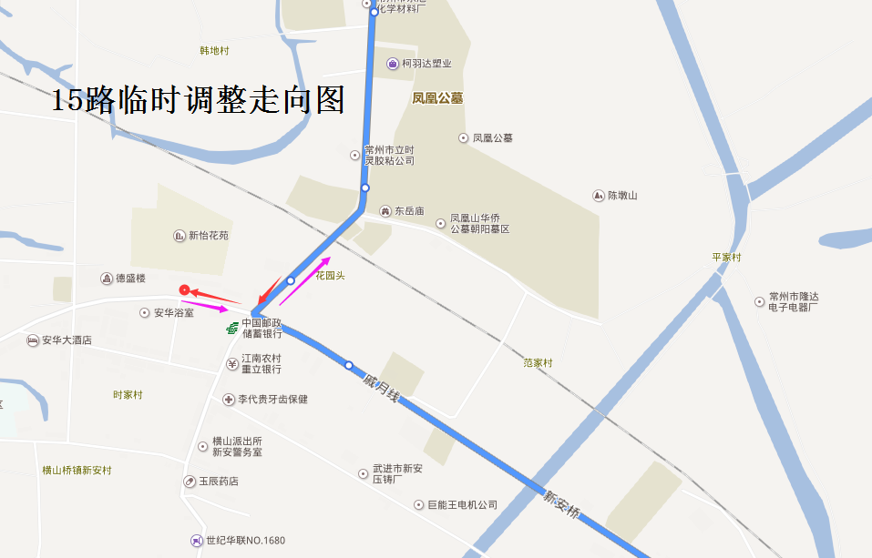 15路:由常州客運中心始發(fā),按原線路行駛至常焦線戚月線路口后,調整行駛戚月線至新怡花苑公交回車場返回。臨時撤消戚月線(常焦線—常芙路)、常芙路(戚月線—芙蓉)行駛路段,同步撤消“亞寶液壓、舍里、西柳塘村西、芙蓉大橋、芙蓉”雙向??空?,調整行駛路段增設“新怡花苑”雙向臨時停靠站。