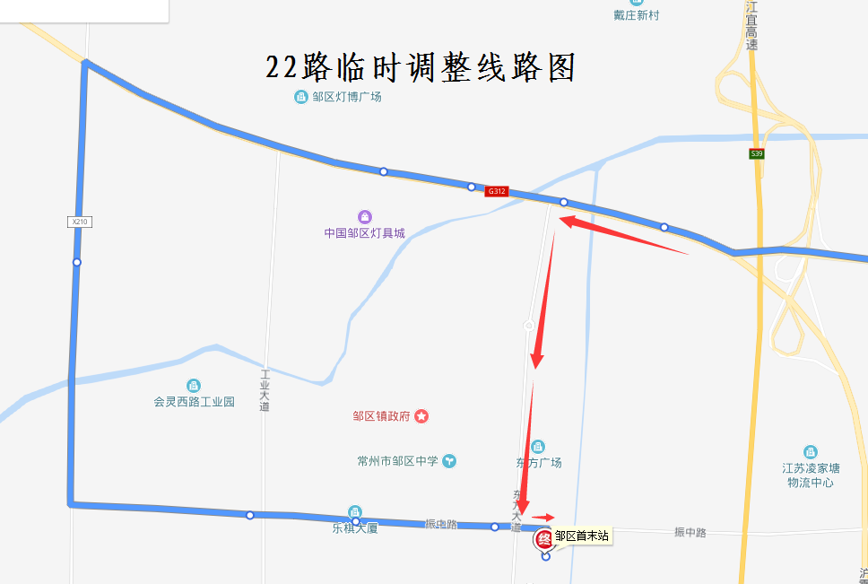 22路:由花園汽車站始發(fā),按原線路行駛至312國道東方大道路口后,臨時(shí)調(diào)整行駛東方大道,至東方大道振中路路口后,恢復(fù)原線路行駛至鄒區(qū)首末站。臨時(shí)撤消312國道(東方大道—騰龍路)、騰龍路(312國道—振中路)、振中路(騰龍路—東方大道)行駛路段,同步撤消“戴莊、鄒區(qū)燈具城、鄒區(qū)新燈城、騰龍路鶴溪路、振中路工業(yè)大道、向陽橋、東方學(xué)校”雙向??空荆R時(shí)調(diào)整行駛路段增設(shè)“鄒區(qū)牌樓、鄒區(qū)興隆街、東方廣場”雙向??空?。