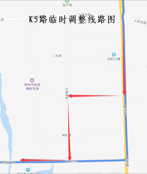 K5路:由潞城公交中心站始發(fā),按原線行駛至青洋路人民路路口后,調(diào)整行駛青洋路、輕紡路至鳳凰路路口后恢復(fù)原線路行駛。臨時(shí)撤銷人民路(鳳凰路—青洋路)、鳳凰路(人民路—江東路)行駛路段, 臨時(shí)撤銷“永寧寺”雙向停靠站。