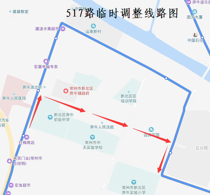 517路:由皮革城路橋(南洋廣場)始發(fā),按原線行駛至天禧路迎賓路路口后,臨時調整行駛迎賓路,至迎賓路興苑路口后,恢復原行駛線路至奔牛萬家富。撤消天禧路(迎賓路—運南路)、運南路(天禧路—興苑路)、興苑路(運南路—迎賓路)行駛路段,同步撤消“天禧橋”、“奔牛福利院”雙向停靠站,臨時調整路段增設“奔牛鎮(zhèn)政府”、“奔牛土管所”雙向臨時??空尽?/span>