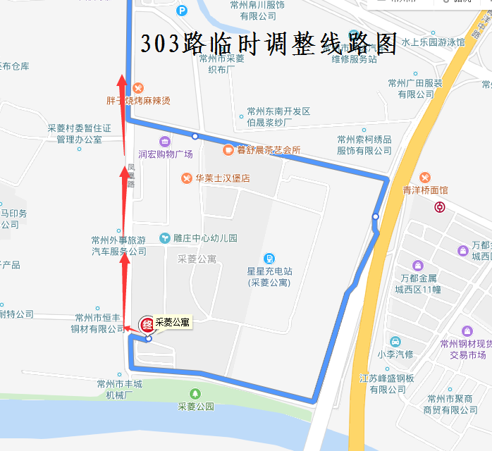 303路:下行由紅梅公交中心站至采菱公寓行駛路線及停靠站點不變。上行由采菱公寓返回時,臨時調(diào)整行駛鳳凰路,至鳳凰路離宮路路口后,按原線行駛至紅梅公交中心站。上行臨時撤銷河濱東路(鳳凰路—青洋路)、青洋路(河濱東路—離宮路)、離宮路(青洋路—鳳凰路)行駛路段,同步撤銷“離宮路青洋路”西行??空?。