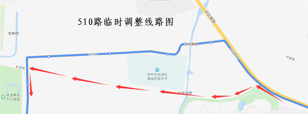 510路:由湖塘樂(lè)購(gòu)始發(fā),按原線行駛至長(zhǎng)虹路虹西路路口后,臨時(shí)調(diào)整行駛虹西路,至虹西路長(zhǎng)江路路口后,恢復(fù)原線路行駛至滆湖療養(yǎng)院。撤銷長(zhǎng)虹路(虹西路—大壩路)、大壩路(長(zhǎng)虹路—長(zhǎng)江路)、長(zhǎng)江路(大壩路—虹西路)行駛路段,同步撤銷“何留”、“大壩”、“淹城中學(xué)北”、“大壩村委”、“夕陽(yáng)紅公寓”雙向停靠站。臨時(shí)調(diào)整路段增設(shè)“淹城中學(xué)”雙向??空?。