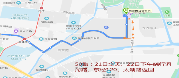 302路:21日、22日下午線路單向繞行龍滄路、河海路、東經(jīng)120路返回。賽事期間縮線繞行龍城大道、惠國(guó)路、廣場(chǎng)大道、晉陵路返回。臨時(shí)撤消奧體中心北至恐龍城公交樞紐雙向??空?23日恢復(fù)原線)